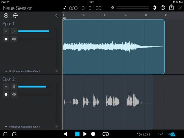 Aufgenommen wird mit der iPad-App Capture Duo, die Du kostenlos aus dem App Store laden kannst. Sie bietet dir in Kombination mit der AudioBox iOne die simultane Aufzeichnung von zwei Spuren. So kannst Du Stimme und Gitarre gleichzeitig aufnehmen – mit geringstem Aufwand.