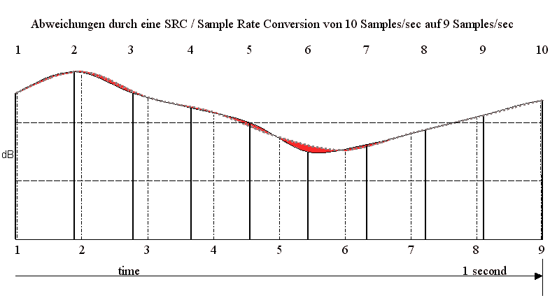 In der Praxis kann sich die Qualität von Sample Rate Convertern unter anderem also dadurch unterscheiden, wie präzise die Berechnung der Position (a) und der Interpolation (b) durchgeführt wurde. In der Realität kommt es allerdings zu wesentlich größeren Abweichungen als in der zuvor erläuterten theoretischen Darstellung.