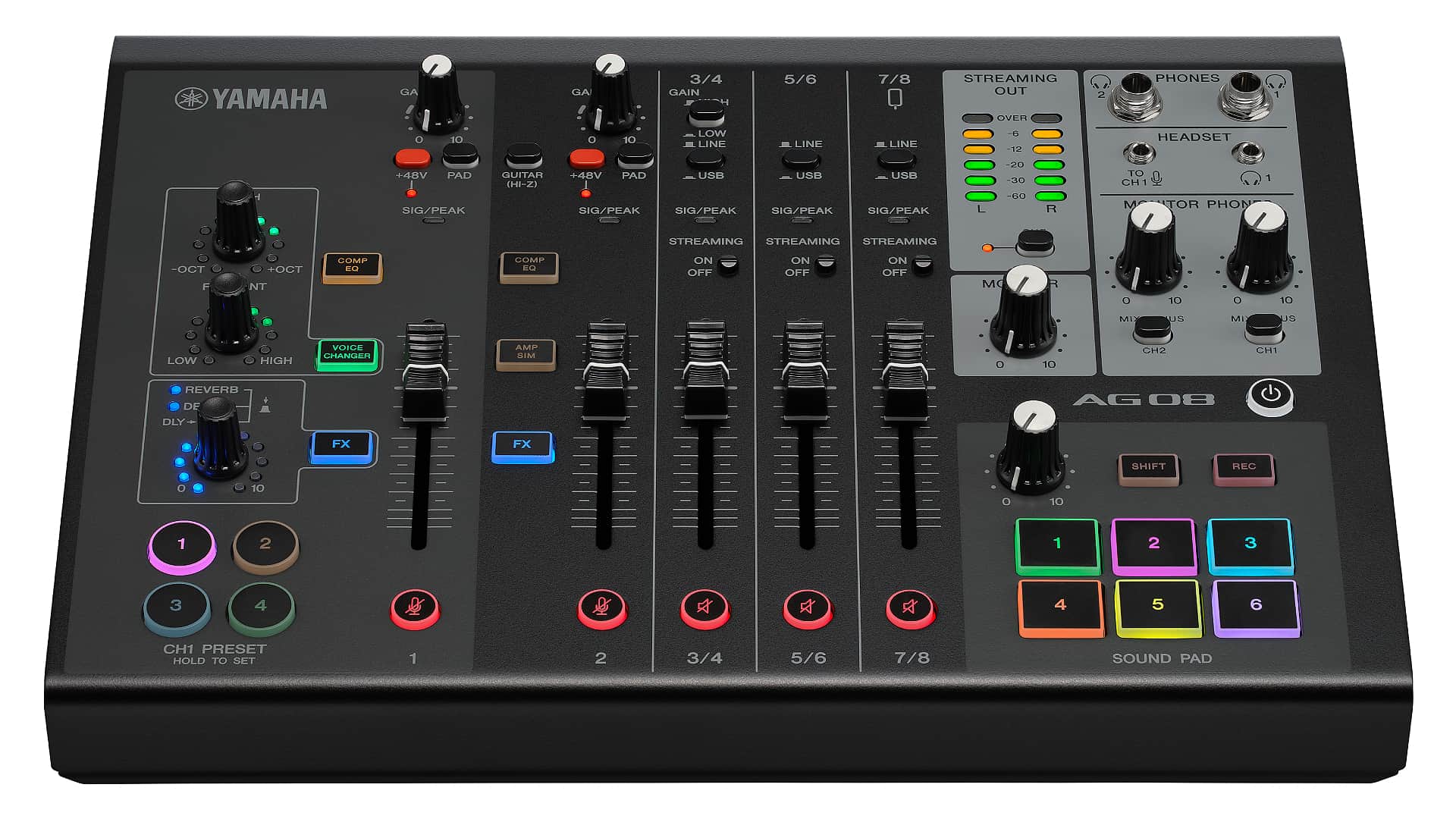 Der Yamaha AG08 ist der Flagschiff Mixer der Gaming und Streaming Sparte des Herstellers. Seine Funktionen gehen deutlich über die eines Mixers hinaus. Er kann auch als Sampler, Effektprozessor, Mehrkanal-USB-Audio Interface und Monitor Controller dienen. Somit lässt er sich auch als komplette Schaltzentrale für deine Streams einsetzen.
