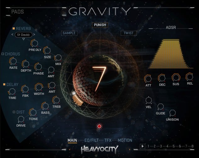 Die graphische Oberfläche von Heavyocity Gravity ist in der Hauptansicht ist eindrucksvoll durchgestylt (vor allem bei der Animation des zentralen Effekt-Drehreglers), was nur im ersten Moment vom Wesentlichen ablenkt. Die Unterteilung in die vier Hauptsektionen dient der Übersicht und ermöglicht es, alle Bedienelemente groß bzw. noch groß genug darzustellen, lediglich deren Beschriftungen sind zuweilen recht klein.