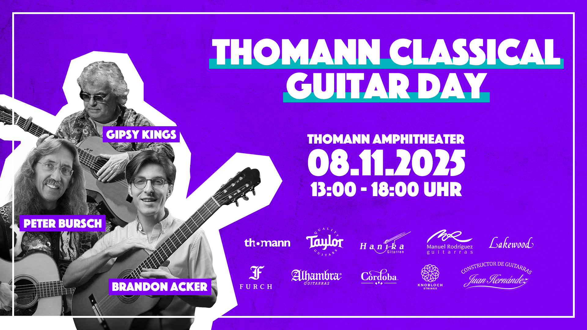 Das Thomann Amphitheater in Burgebrach wird am 8. November 2025 zum Zentrum für klassische Gitarrenmusik. Von 13 bis etwa 18 Uhr präsentieren sich führende Gitarrenhersteller mit Workshops und Vorträgen. Der Eintritt ist kostenlos, eine Anmeldung ist erforderlich.
