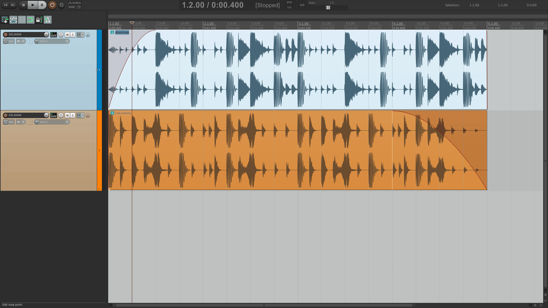 Nehmen wir beispielsweise die Einblendung in der obigen Abbildung. Das genutzte Programm (Reaper) legt eine Kurve über den Anfang der ersten Spur – es arbeitet non-destruktiv.