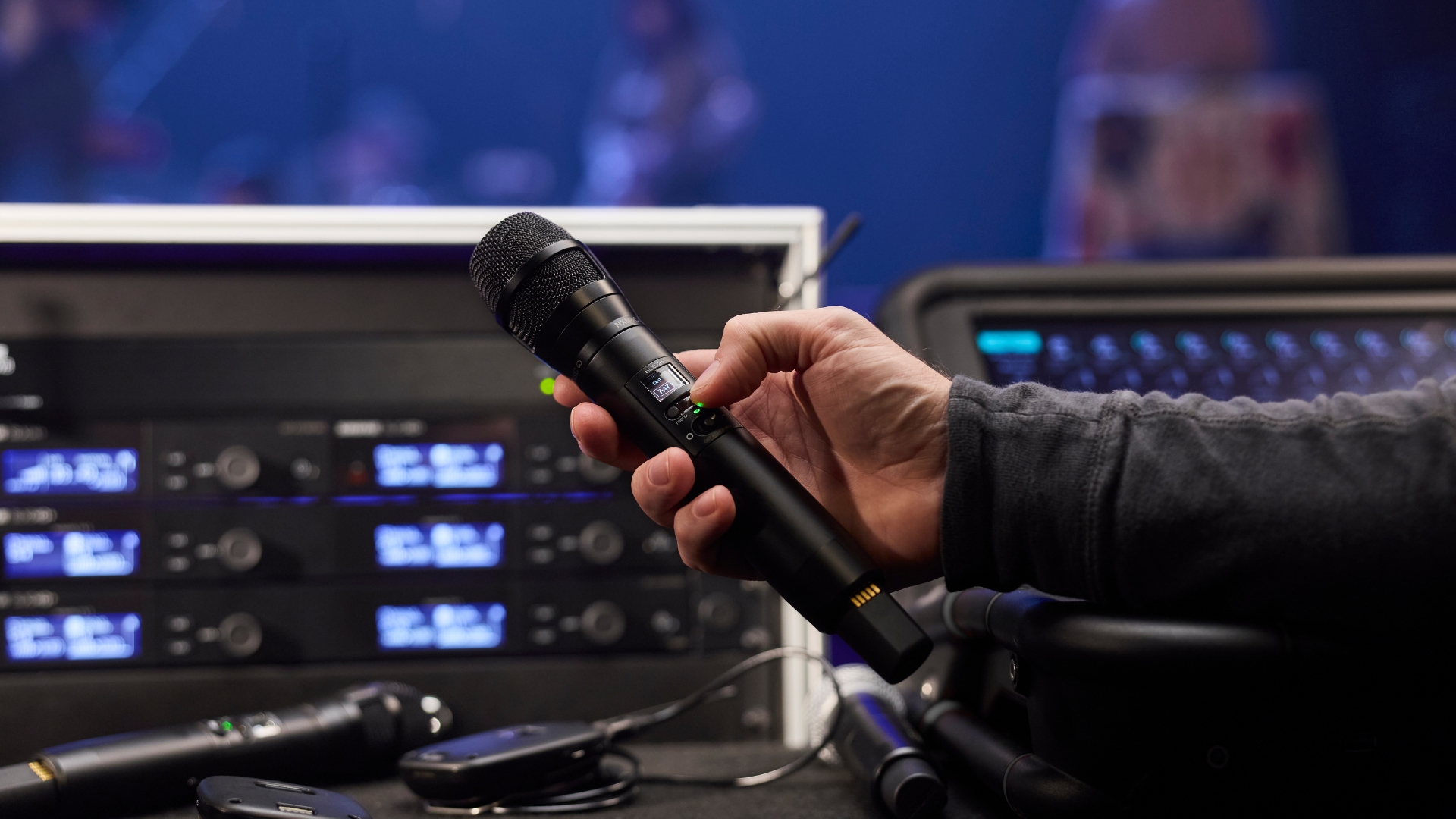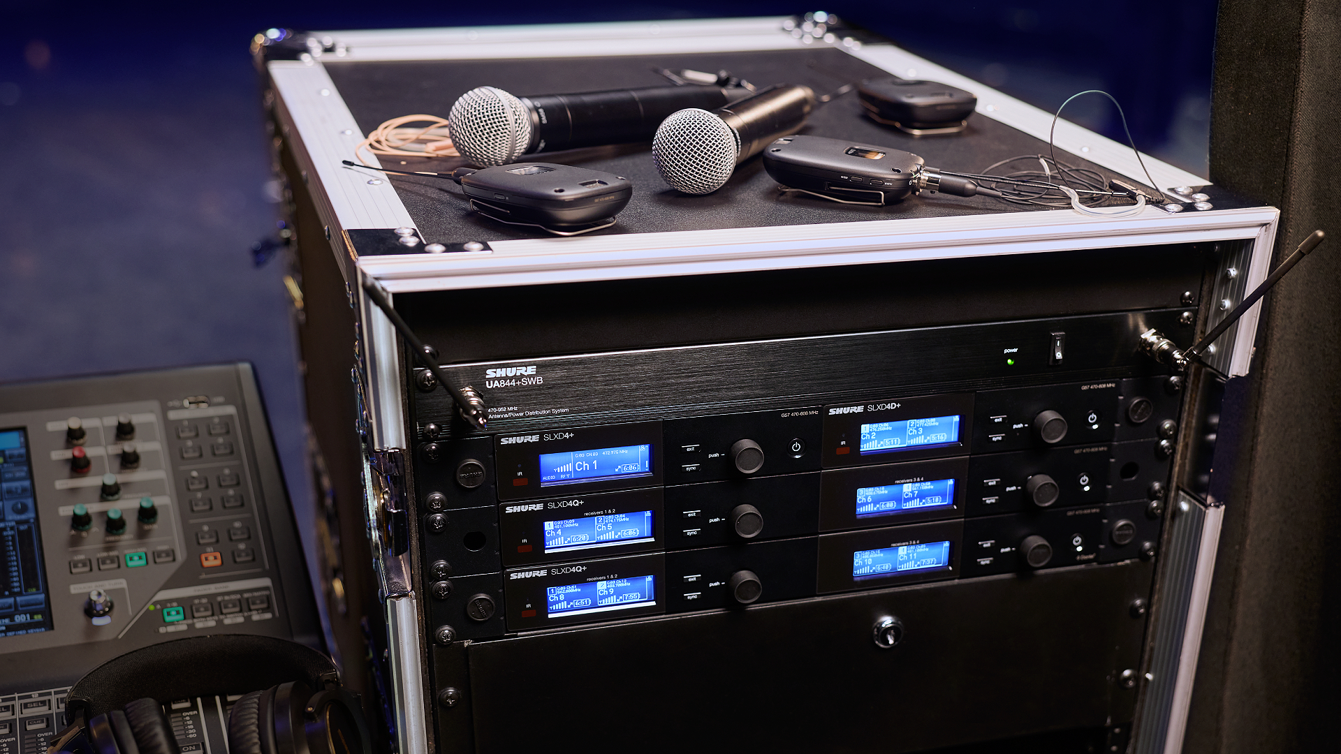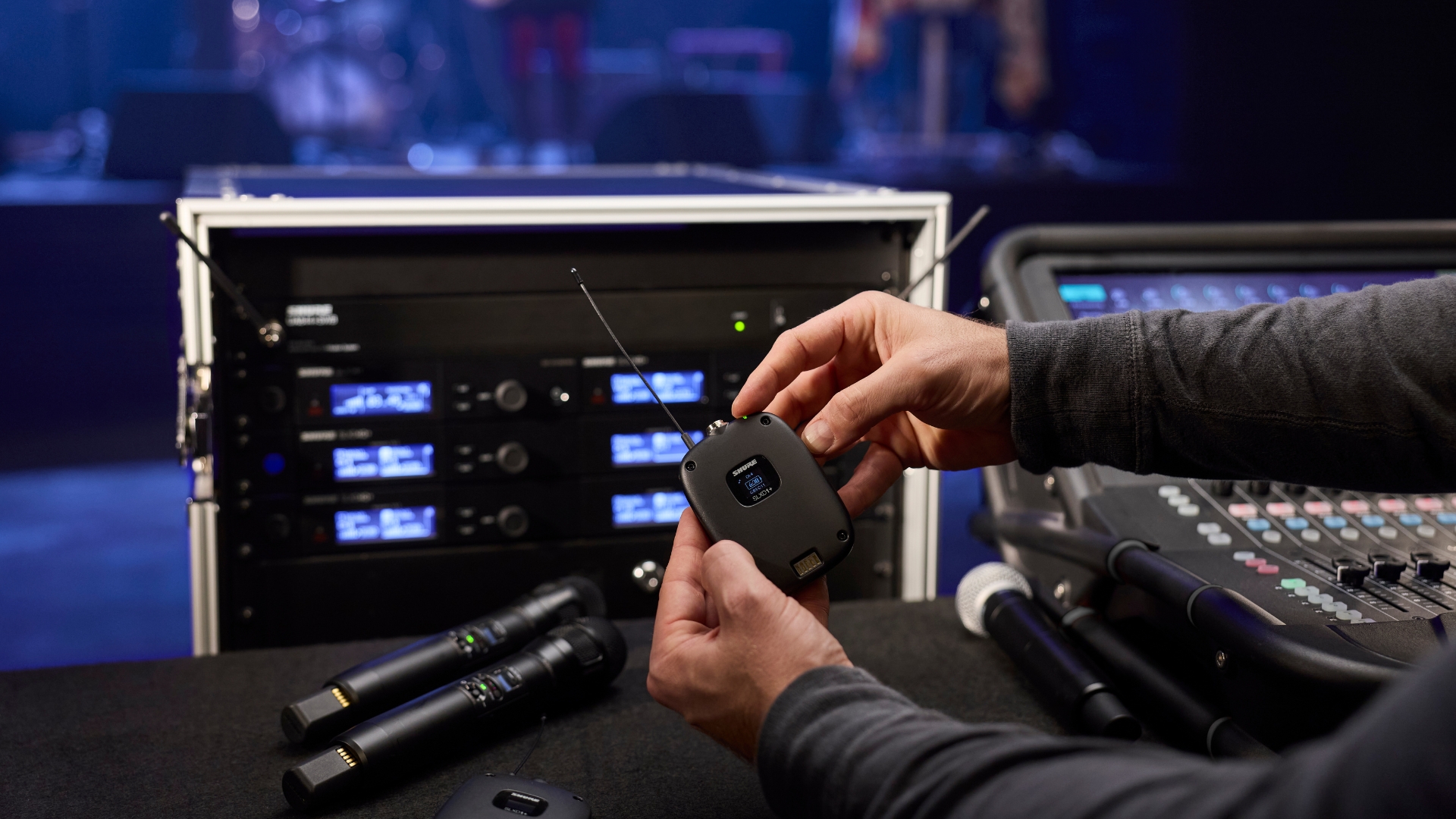 Im Rack arbeitet ein komplettes Funksystem, während Handsender und Bodypacks schon auf ihren nächsten Einsatz warten.