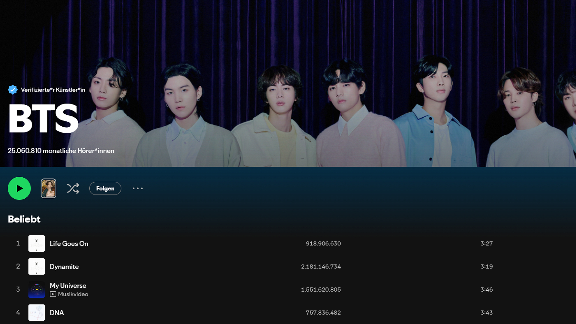 Meistgestreamte Künstler Spotify BTS