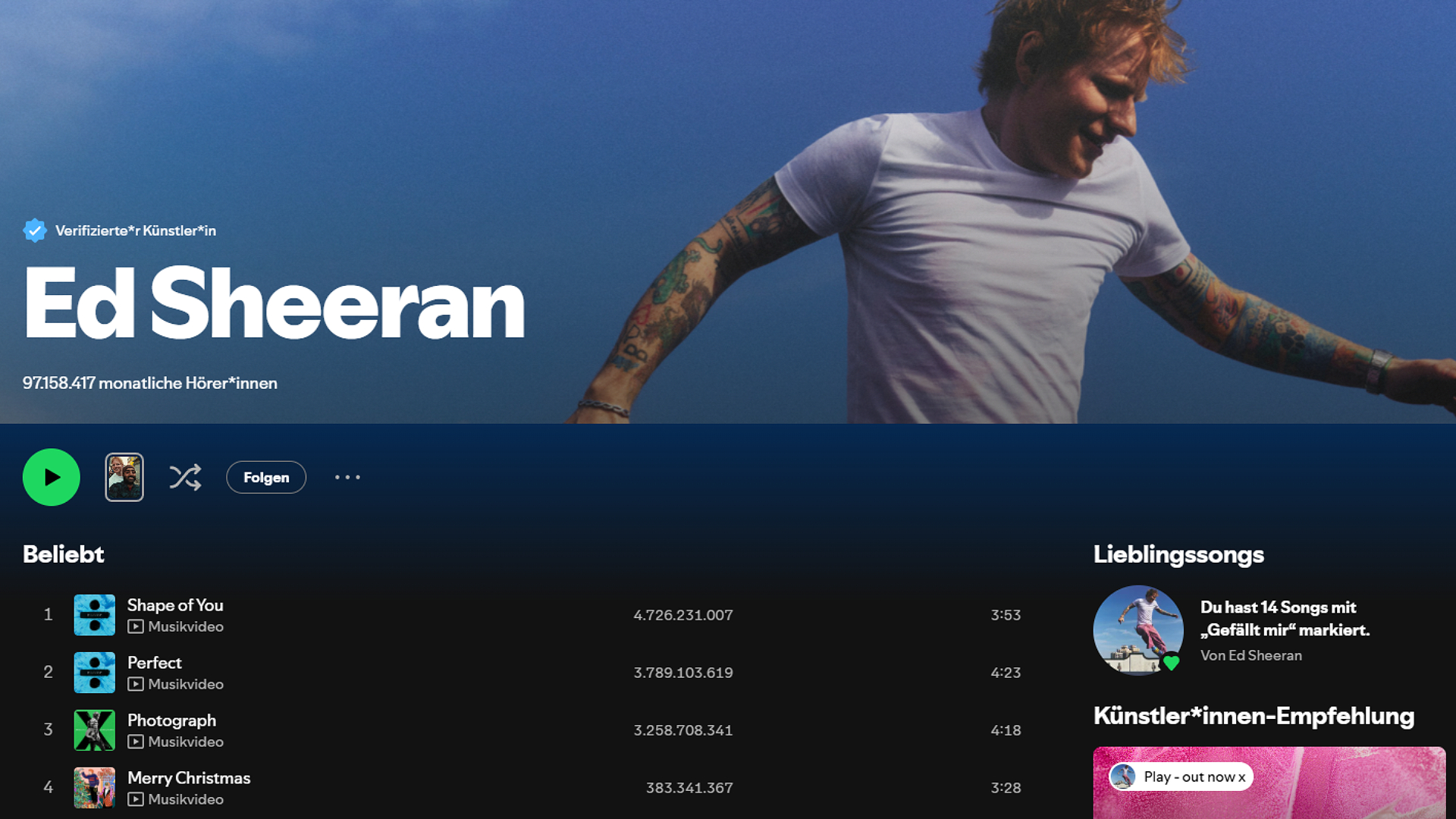 Meistgestreamte Künstler Spotify Ed Sheeran