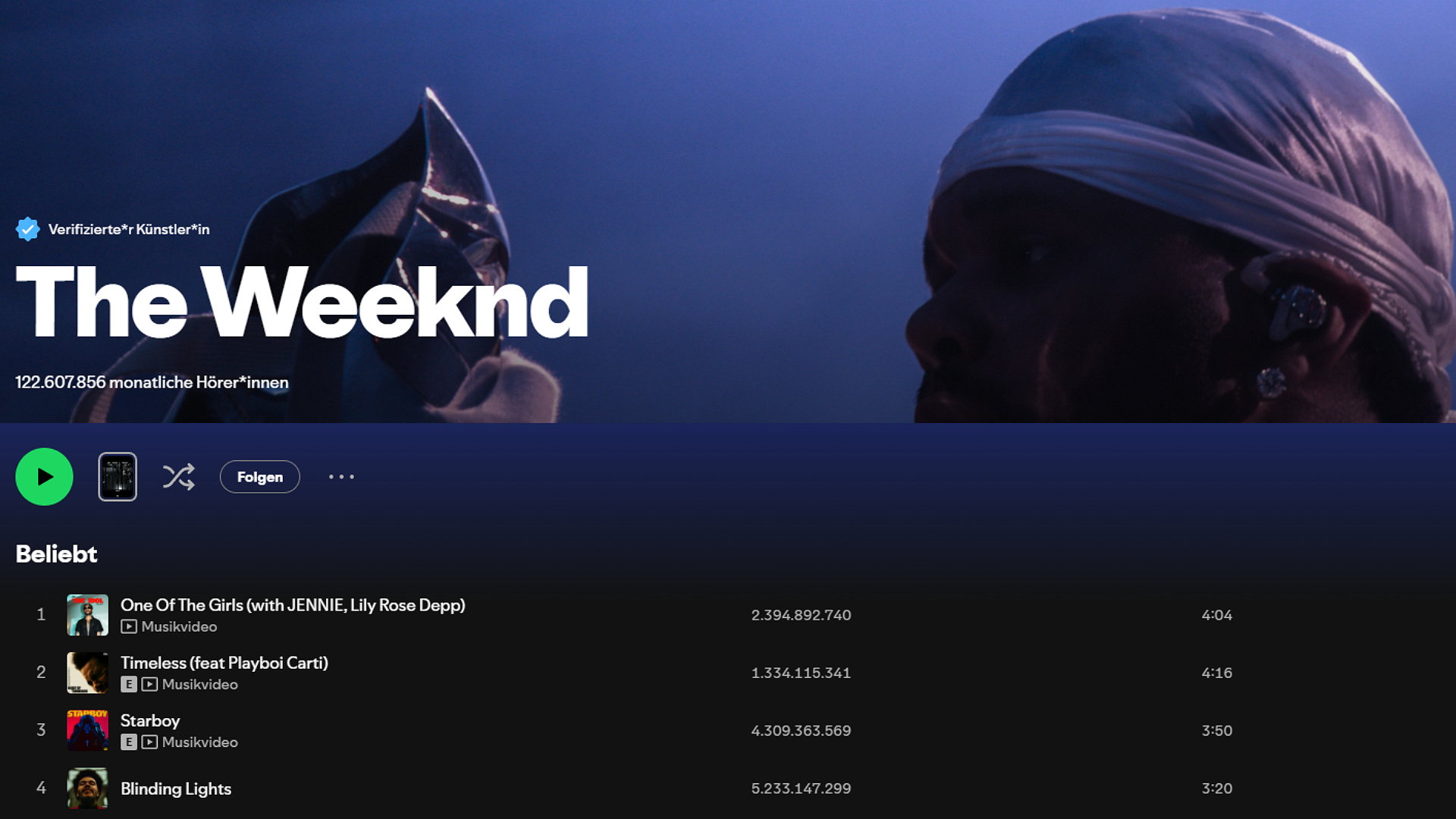 „Blinding Lights“ ist der meistgestreamte Song auf Spotify. Somit ergattert er sich einen Platz auf Nr. 4 der meistgestreamten Spotify Interpreten.