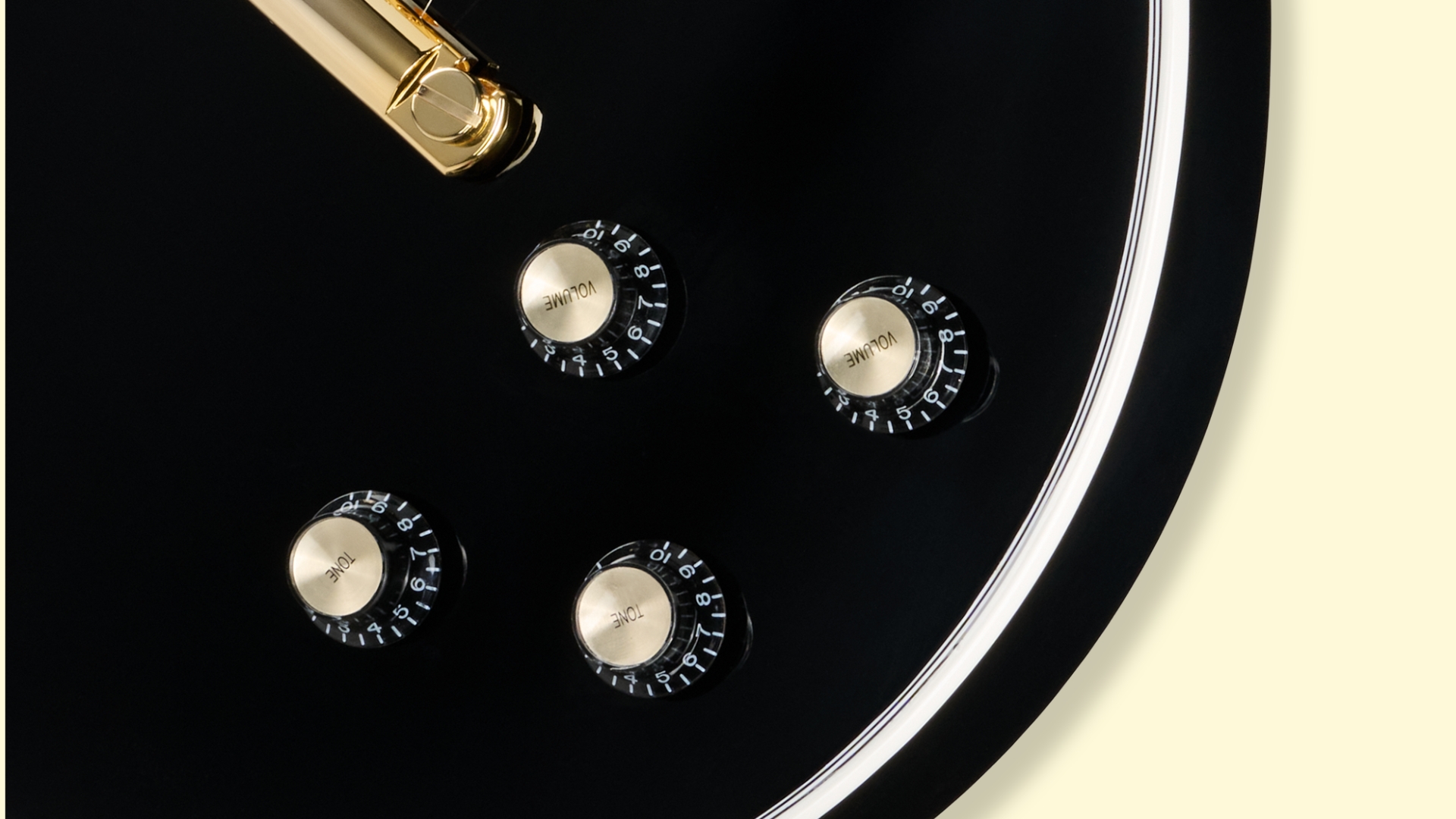 Die Bedienelemente bestehen aus schwarzen Top-Hat-Knöpfen mit goldenen Einsätzen. Ein 3-Wege-Toggle-Schalter ermöglicht die Auswahl der Tonabnehmer. Die Ausgangsbuchse ist als Standard-Klinkenbuchse ausgeführt.