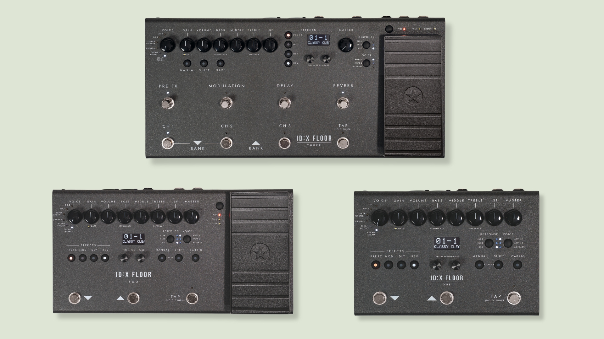 An der Spitze steht das ID:X Floor Three mit MIDI IN und THRU sowie einem Effektweg für externe Pedale. Es bietet erweitertes Switching und ein größeres Gehäuse für umfangreichere Bühnensetups. Der Workflow bleibt über alle drei Modelle hinweg identisch.