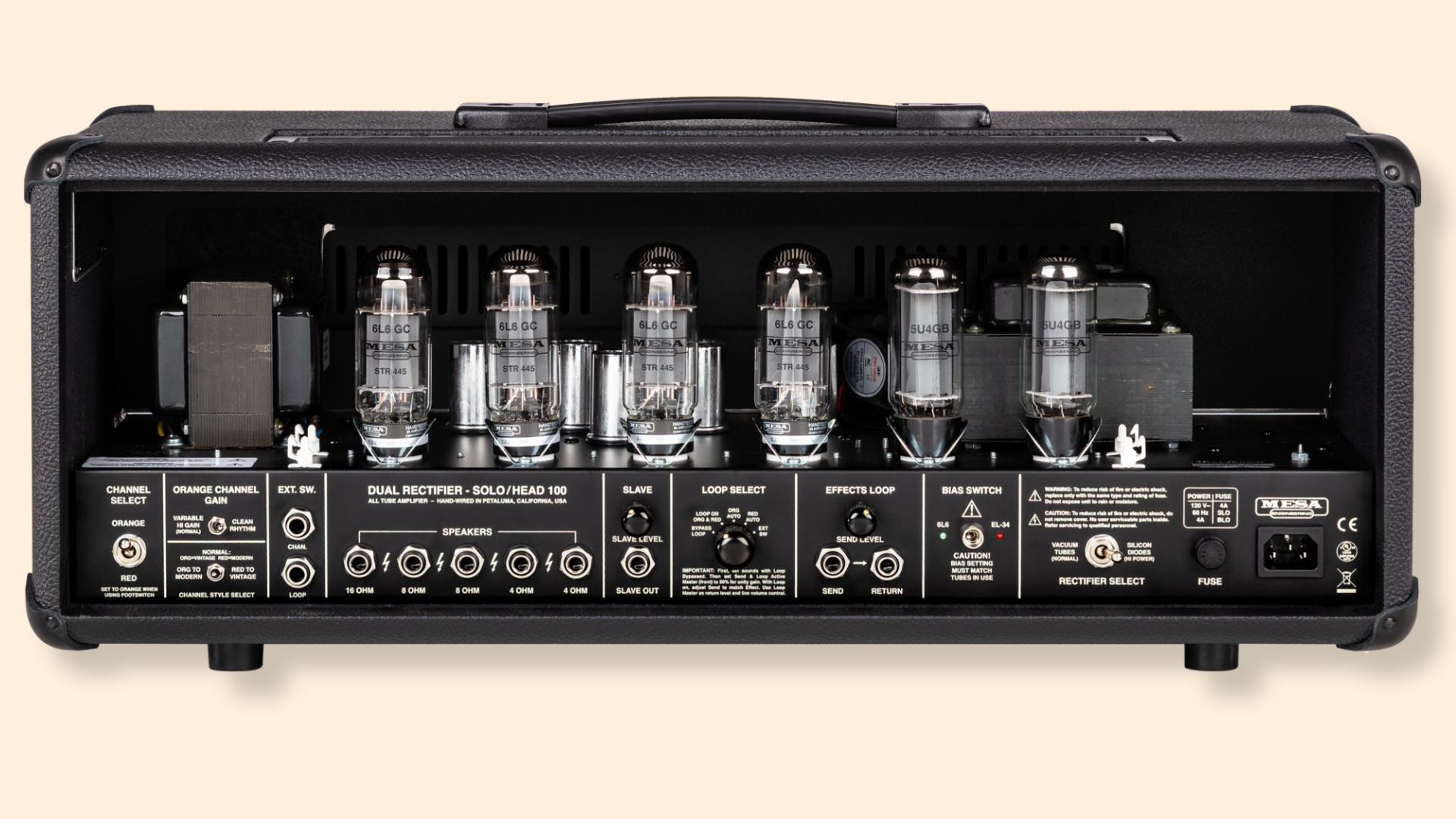 Der BOLD/SPONGY-Schalter arbeitet als Variac-Funktion. Er reduziert die Betriebsspannung im SPONGY-Modus. Die Endstufe liefert 100 Watt im Class-A/B-Betrieb. Vier MESA 6L6 Röhren treiben die Ausgangssektion an. Der Bias-Select-Schalter ermöglicht den Wechsel zu EL34-Röhren.