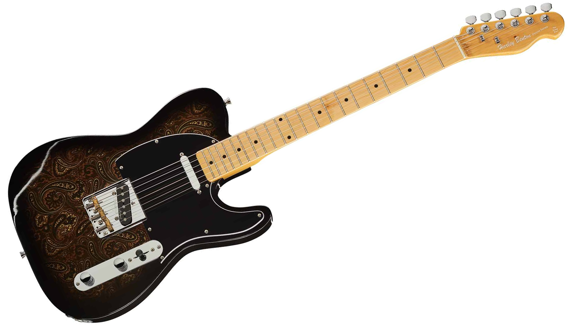 Diese Gitarre ist eine sehr günstige Telecaster mit ihren typischen Eigenschaften wie einem geschraubten Ahornhals und zwei Tonabnehmern. Die E-Gitarre von Harley Benton wurde mit schwarzer Paisley Lackierung aufgewertet.