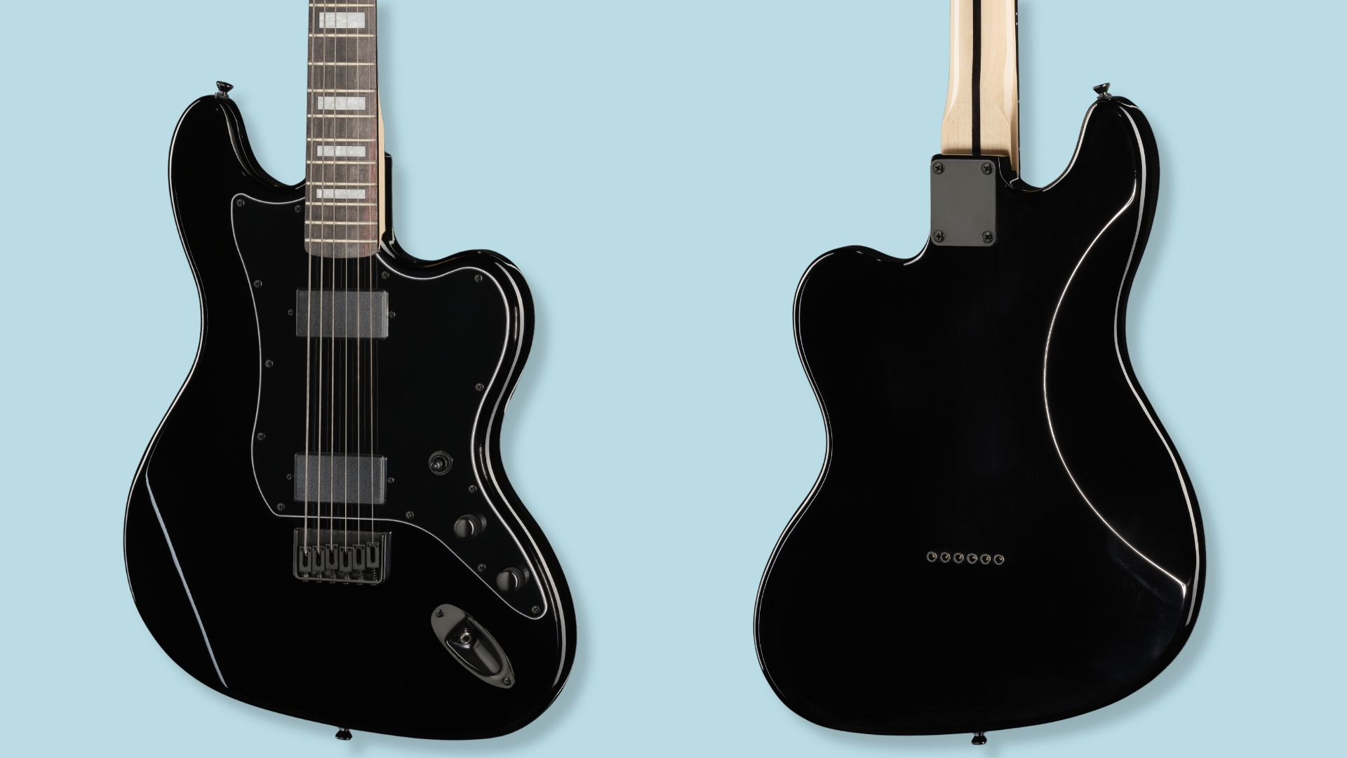 Der Korpus im Offset-Design besteht aus Pappelholz. Die Hochglanzlackierung in Schwarz erstreckt sich auch auf die Kopfplatte. Das Purpurholz-Griffbrett bildet einen optischen Kontrast zur sonst durchgehend schwarzen Farbgebung.