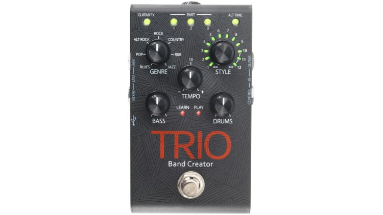 Das DigiTech Trio ist eine Mini-Begleitband, getarnt als Gitarren-Pedal – es erstellt zu deinem Gitarrenspiel in den meisten Fällen sehr stimmige Rhythmusbegleitungen aus E-Bass- und Schlagzeugklängen. Gerade für das Üben und Jammen zuhause eignet sich dieses Modell bestens.