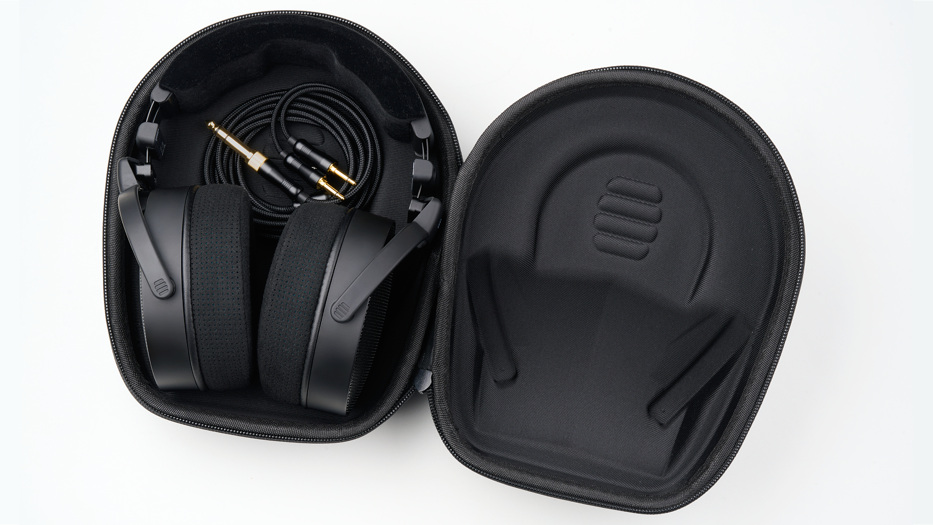 Der Kopfhörer verfügt über zwei 3,5mm Mono-Anschlüsse für die abnehmbaren Kabel. Im Lieferumfang befinden sich zwei textilummantelte Premium-Kabel sowie ein 6,35mm Adapter für professionelle Audiogeräte. Ein maßgefertigtes Transport-Case schützt den Kopfhörer beim Transport.