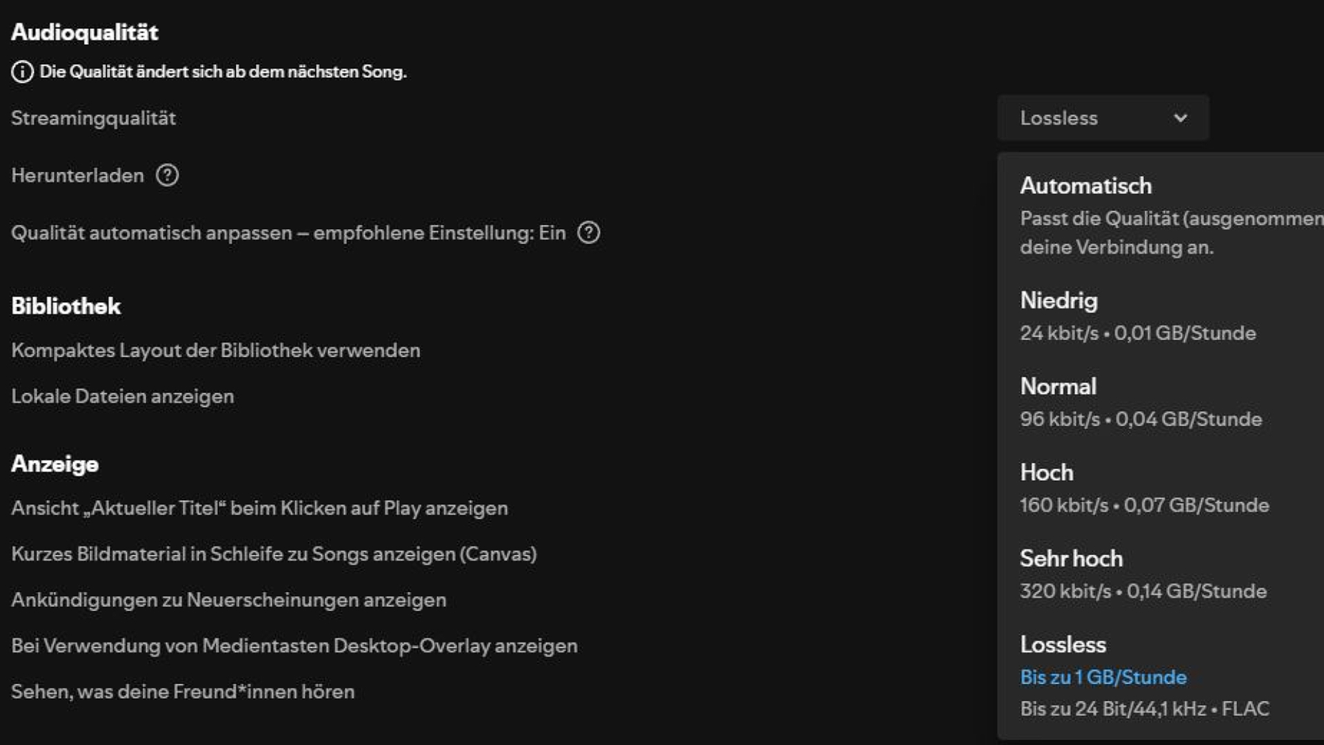 In der App stehen mehrere Qualitätsstufen zur Auswahl, je nachdem ob Du unterwegs Daten sparen willst oder zuhause über WLAN volle Qualität abrufst. Die nicht-Lossless Stufen liegen im mp3-Format vor.