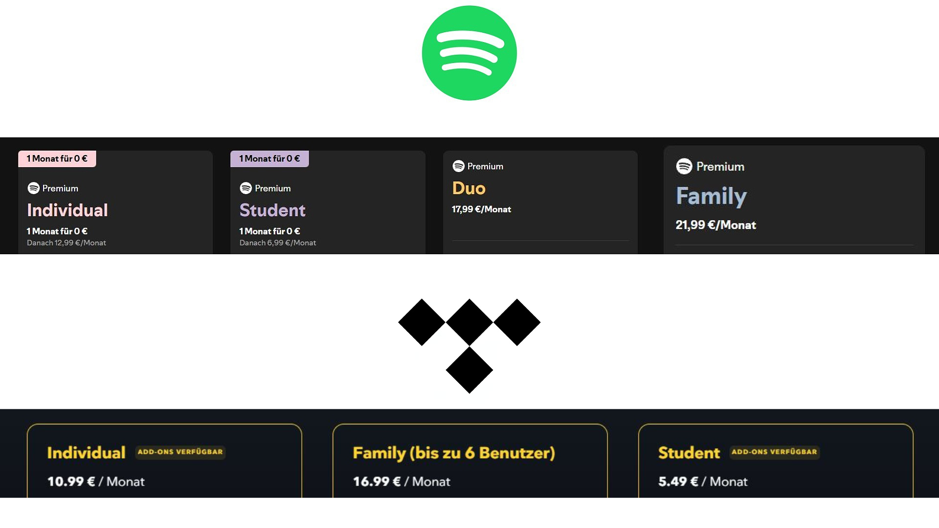 TIDAL und Spotify bieten mehrere Preisstufen an – vom günstigen Studierenden-Tarif bis zum Familienabo. Der größte Unterschied: Spotify hat nach wie vor ein kostenloses, werbefinanziertes Angebot, während TIDAL ausschließlich kostenpflichtige Abos führt.