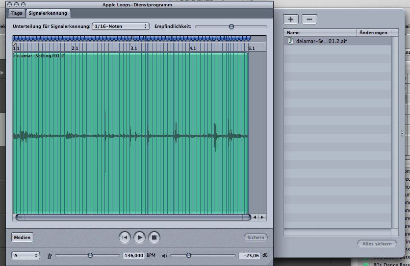 5. Im Reiter „Signalerkennung“ siehst Du nun, wo Logic überall Transienten erkannt hat. Hier gilt: Je mehr, desto besser. Ausserdem kannst Du hier noch die Standartwerte für Songtempo und Volume einstellen.