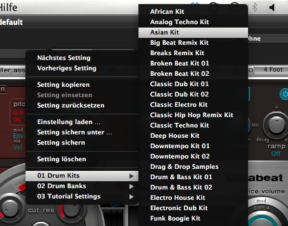 Oben in den Settings kannst du eins von vielen mitgelieferten Kits auswählen. In diesem Beispiel wähle ich das Preset »Asian Kit«. Nun werden das Kit und die Synthesizer-Einstellungen geladen. Um wirklich zu verstehen, was welcher Filter und welche Modulation machen, solltest Du das Handbuch lesen und einfach einmal ausprobieren. Ich mache das Gleiche. ;-)