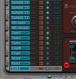 Infolgedessen solltest Du Mono-Samples den Mono-Outputs zuweisen und die Stereo-Samples den Stereo-Outputs. Du kannst auch Mono-Samples ohne Klangverluste auf Stereo-Outputs schicken, aber nicht umgekehrt. Sonst wird dein Stereo-Sample plötzlich monaural wiedergegeben. Doch die meisten Drum Samples sind sowieso in Mono. Jetzt weist Du jedem Sample einen anderen Output zu.