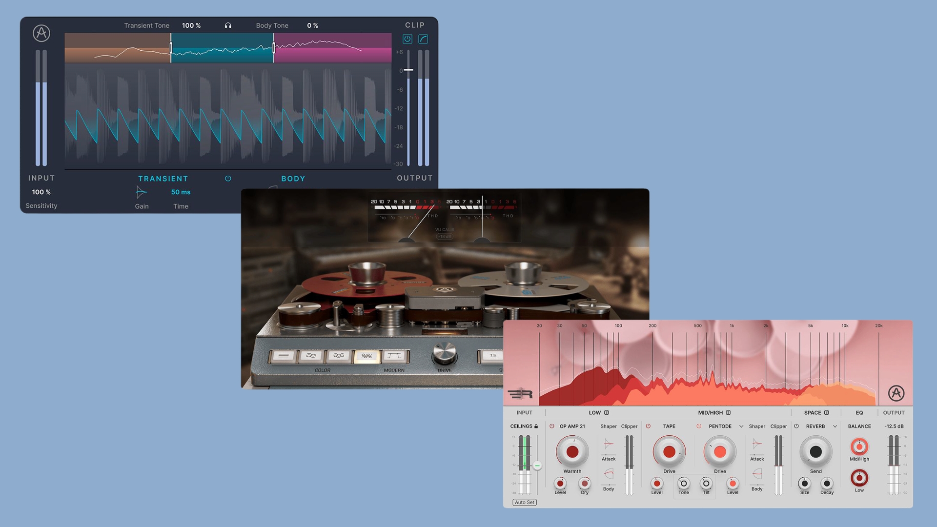 Das Plugin enthält integrierte Clipping- und Tone-Controls. Diese ermöglichen zusätzliche klangliche Anpassungen. Der Visualizer hilft bei der Einstellung, indem er Transienten und Body-Anteil in Echtzeit darstellt. Das soll laut Hersteller schnelles und musikalisches Arbeiten ermöglichen.