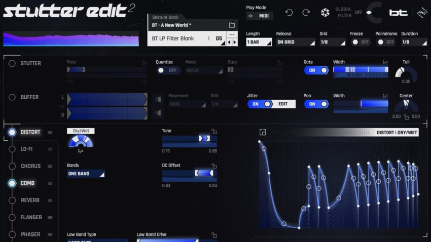 Außerdem gibt es ein neues Distort-Modul, neue Comb-, Chorus und Limitermodule, einen Hall-Effekt aus Brian Transeaus persönlicher Sammlung sowie 11 weitere Effekte. Egal ob automatisierte Panoramafahrten oder pulsierende Halleffekte, jeder Parameter kann automatisch – zusammen mit „Gestures“ – in Bewegung gesetzt werden.