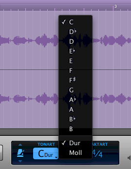 5. In den Projekteinstellungen nun noch eine Tonart auswählen. (Im Transportfeld wo die Taktposition angezeigt wird links auf die Note klicken und dort dann “Projekt” wählen, danach bei Tonart die gewünschte Tonart auswählen)