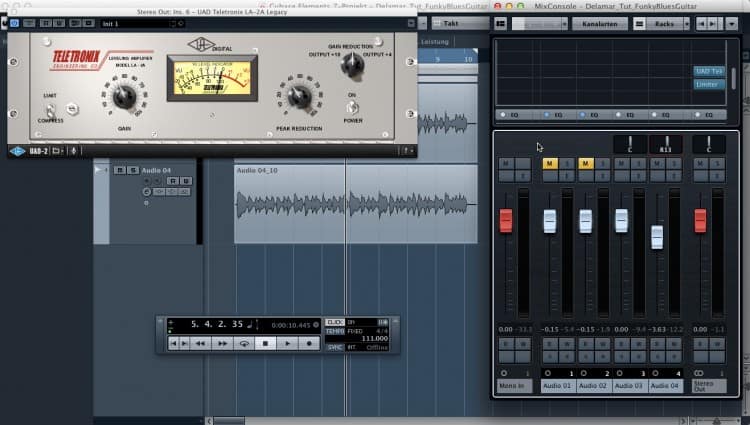 Im Anschluss kannst Du die frisch aufgenommenen Spuren in Deiner DAW beliebig weiterbearbeiten bzw. in einen bereits bestehenden Mix einbinden. Natürlich stehen dir die UAD-Plugins aus dem »Realtime Analog Classics Bundle« auch in Deiner DAW zur Verfügung. Für den finalen Mix beider Gitarrenspuren habe ich lediglich noch den LA-2A Levelling Amplifier sowie den Cubase-internen Limiter eingesetzt.