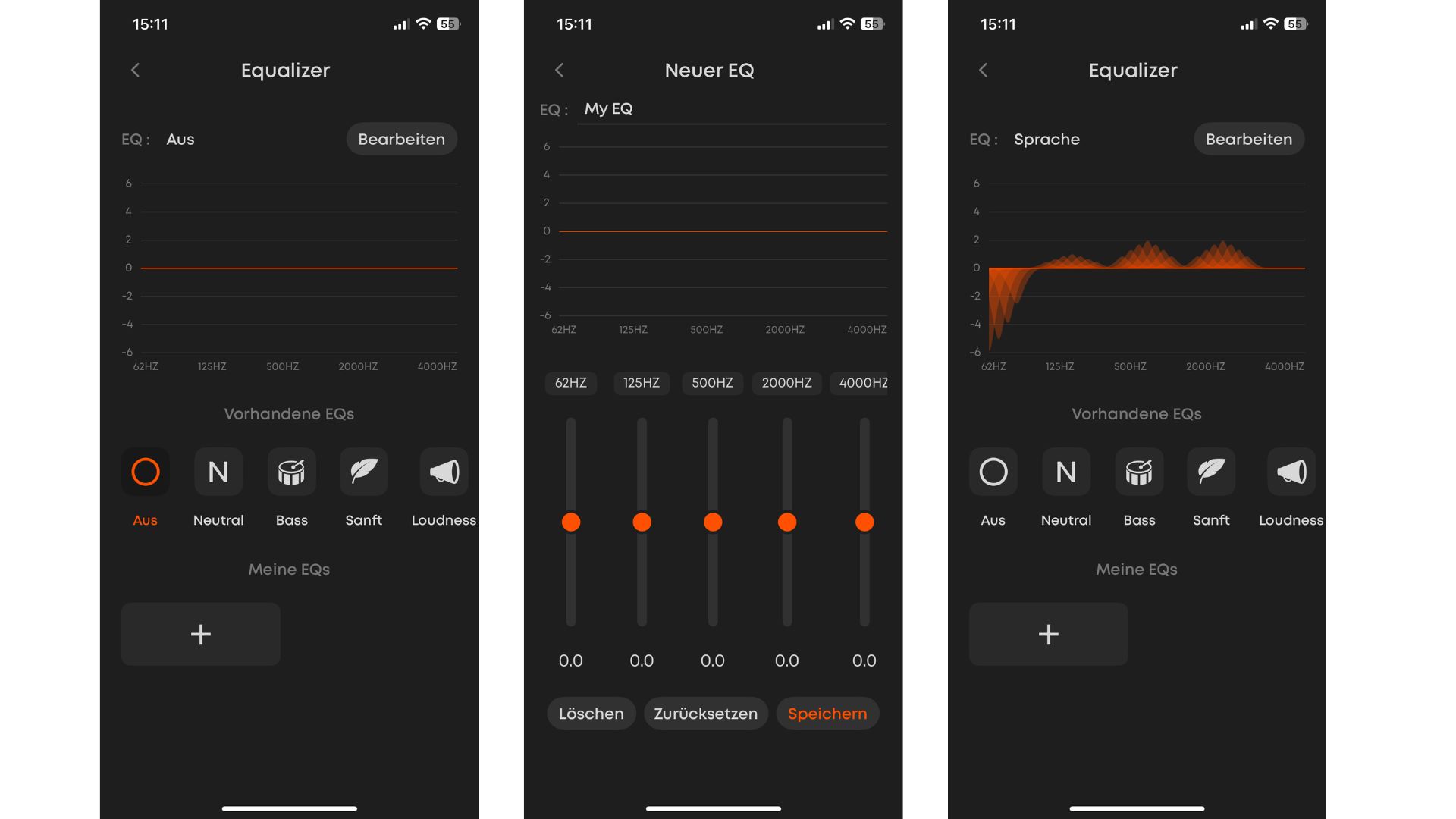 Der Equalizer bietet Presets wie Neutral, Bass, Sanft, Loudness und Sprache. Eigene Klangpresets lassen sich ebenfalls erstellen.