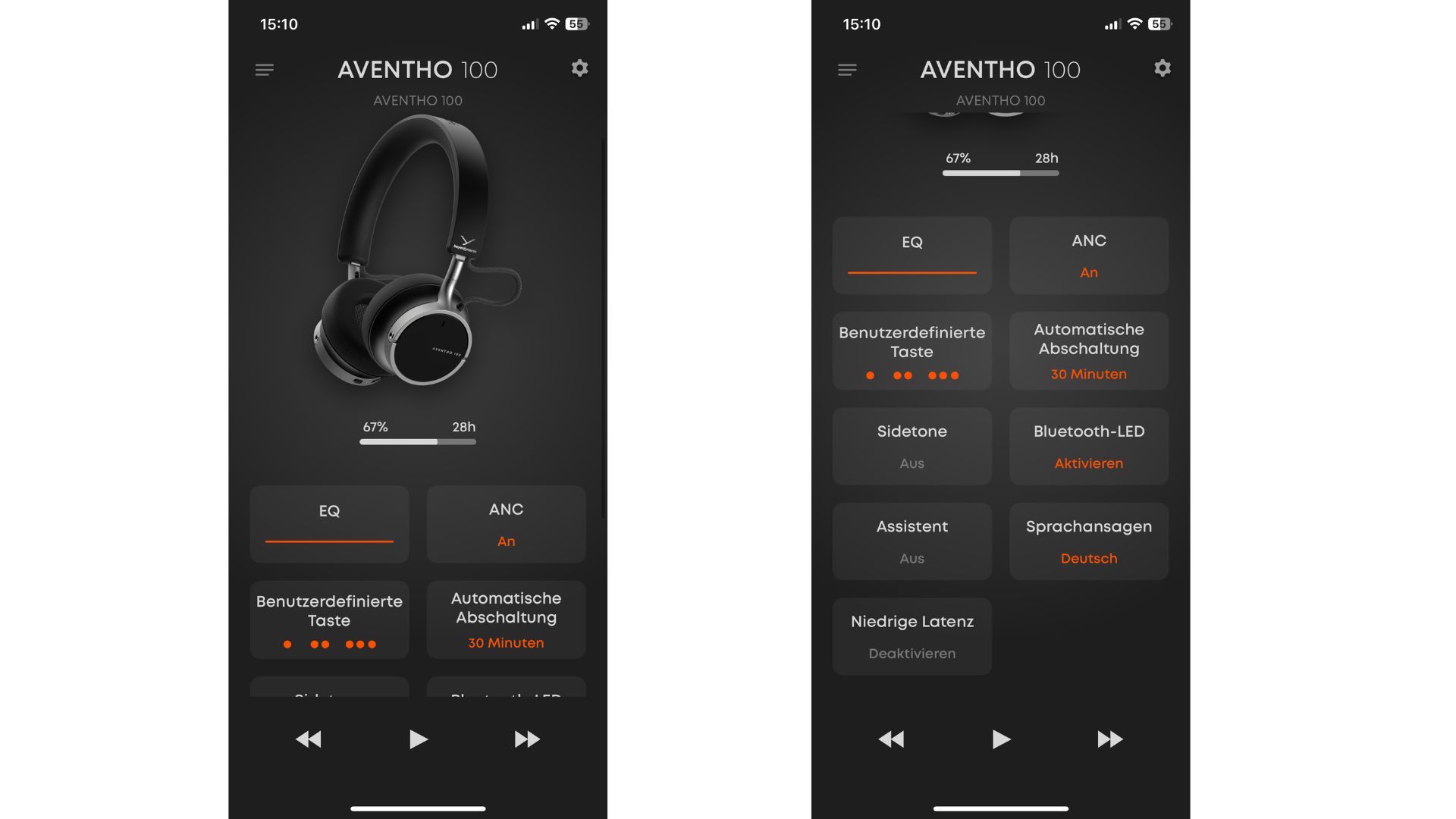 Über die App steuerst Du unter anderem Equalizer, ANC-Modi, Tastenbelegung, automatische Abschaltung, Sidetone für Telefonate, Bluetooth-LED, Sprachassistent und Sprachansagen.