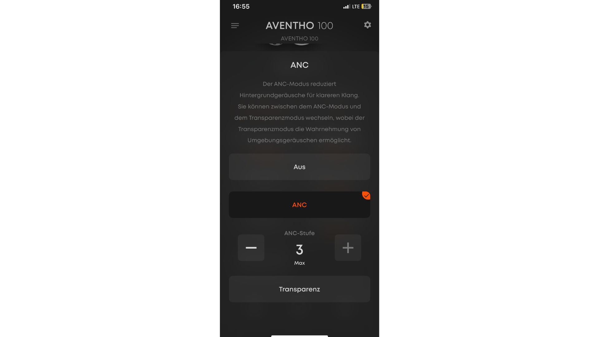 Im ANC-Menü kann zwischen ausgeschalteter Geräuschunterdrückung, aktivem ANC und Transparenzmodus gewechselt werden.