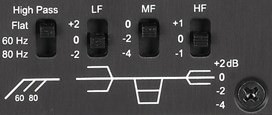 Der Frequenzgang wird vom Hersteller mit 46 Hz bis 21 kHz angegeben, der maximale Schalldruck liegt bei 117 dB (Peak). Zur Anpassung an die Raumakustik stehen drei Filter mit je drei Einstellungen für die Anhebung/Absenkung in den Bässen, Mitten und Höhen zur Verfügung, dazu kommt noch ein separater Hochpassfilter mit drei möglichen Einstellungen. Außerdem gibt es einen Schalter zum Anpassen an den Eingangspegel mit -10, ±0 und +4 dB.