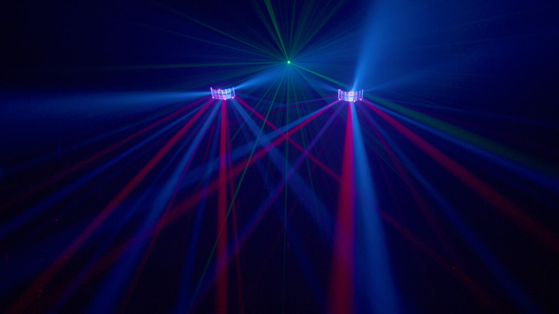 Die Kombination aus 8 W QCL-Spots, RGBW-LEDs und rotierenden Derbys erzeugt verschiedene Licht- und Bewegungseffekte. Zwei Laserdioden projizieren zahlreiche rote und grüne Strahlen, die gerade bei Nebel sichtbar hervortreten.
