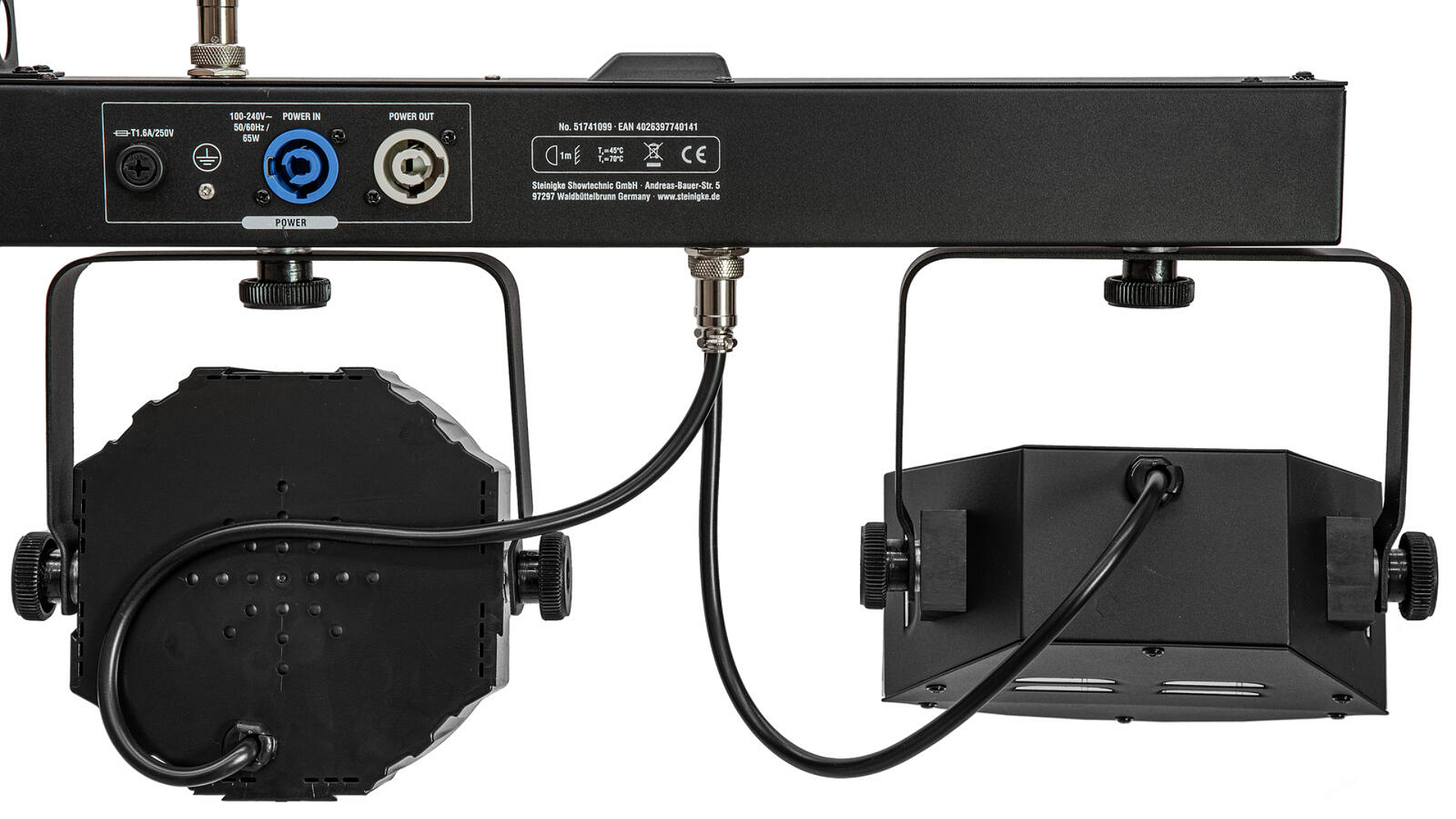 Die beiden PAR-Scheinwerfer sind mittig auf der Leiste angebracht und hängen nach unten. Jeder PAR besitzt jeweils drei RGB/WW (Rot Grün Blau/WarmWeiß)-LEDs.