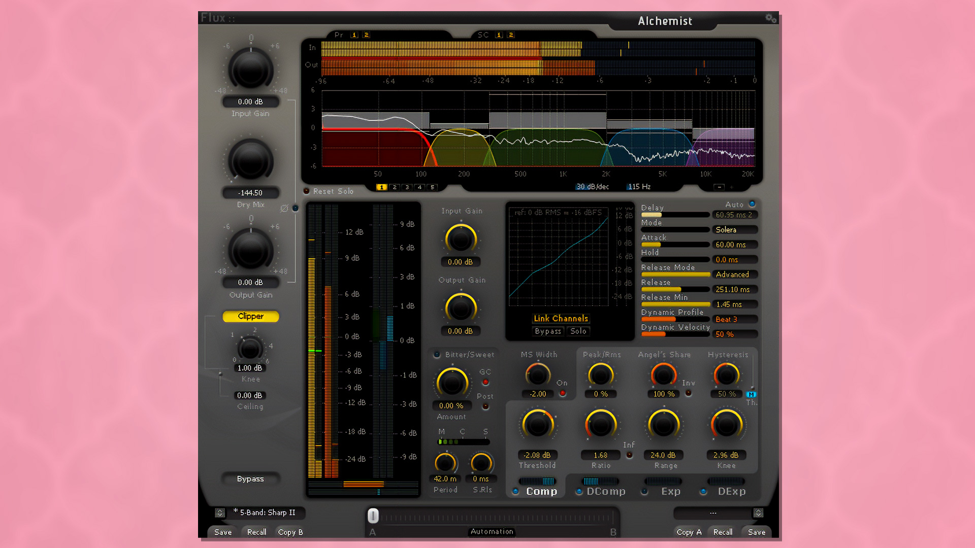 Der Flux Alchemist ein Werkzeug für Profis. Die Transferkurve lässt sich dank der freien Kombinationsmöglichkeiten aller vier Dynamikeffekte in exotische Formen bringen. Zusammen mit der Transientenbearbeitung, »Angel’s Share«, der Hysterese, der schlichten M/S-Bearbeitung und – nicht zu vergessen – der Überblendungsmöglichkeit zwischen zwei Presets entstehen maßgeschneiderte Klänge für alle Anwendungen.