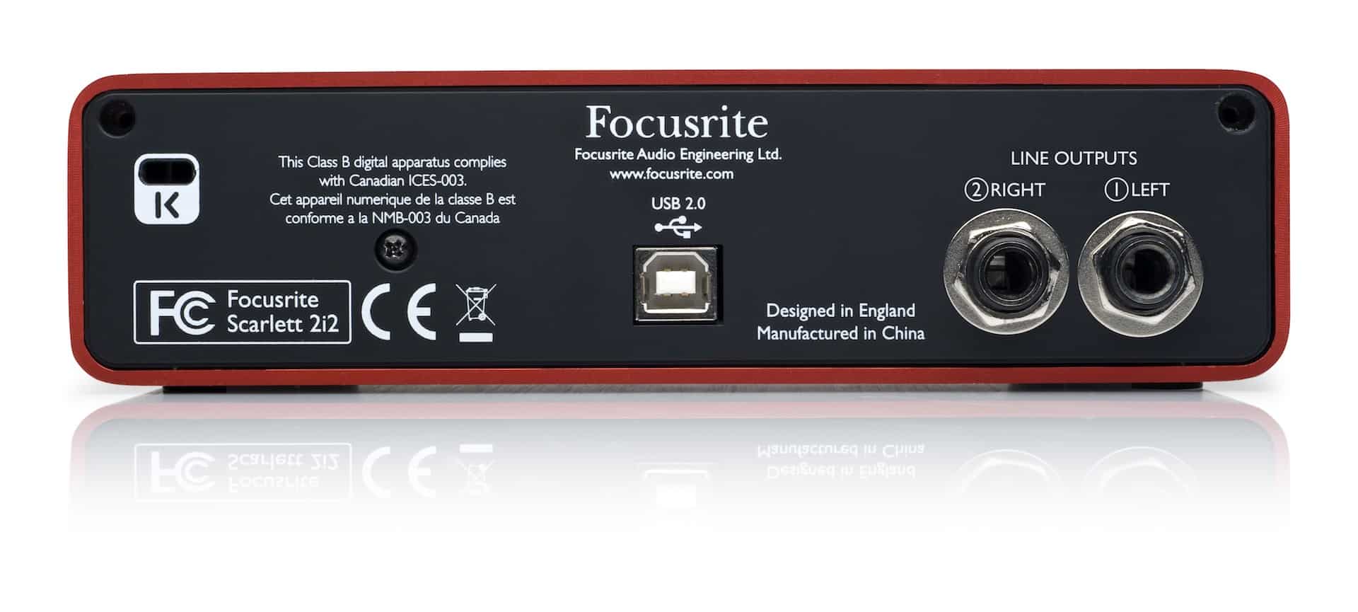 Die Rückseite ist schnell abgehandelt. Hier gibt es lediglich drei Punkte, die von Interesse sind – eine Öffnung für ein Kensington-Kabelschloss, mit dem Du das Scarlett 2i2 an einem festen Gegenstand befestigen kannst, den USB-Anschluss (Typ B, USB 2.0) und die zwei symmetrischen Klinkenausgänge für das ausgehende Stereo-Line-Signal (linker und rechter Kanal).