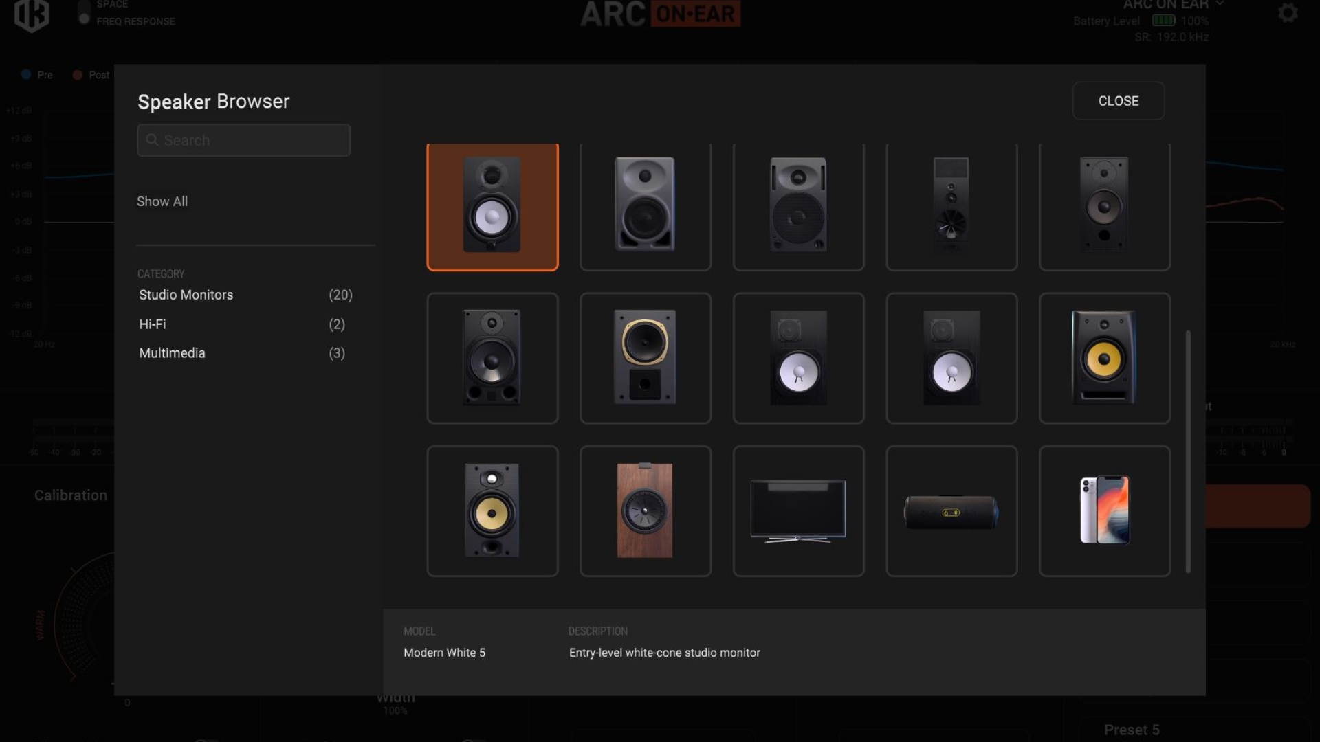 Zusätzlich zu den Studiomonitoren lassen sich noch zwei Hi-Fi-Monitore sowie ein Fernsehlautsprecher, ein Bluetooth-Lautsprecher und ein Smartphone-Lautsprecher simulieren.