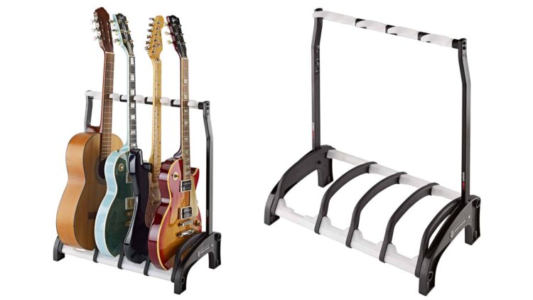 Der Guardian 3+1 ist ein durchdachter Gitarrenständer für drei E-Gitarren und eine Akustikgitarre.