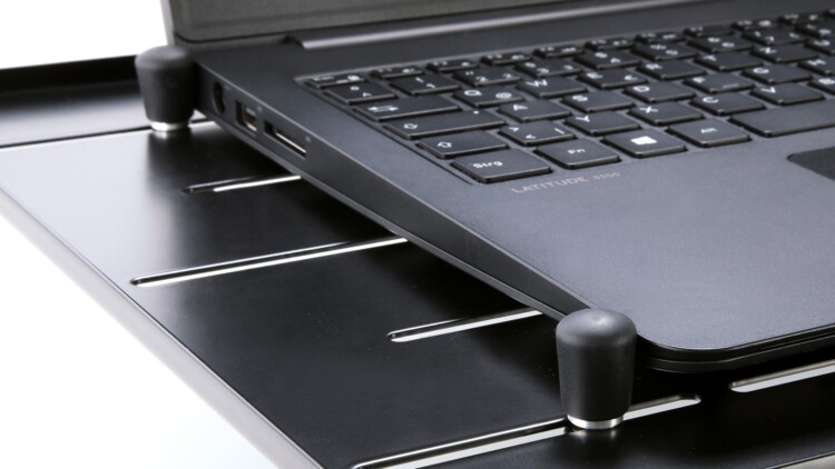 Eine Besonderheit des 12185 sind die vier verstellbaren Klemmbolzen mit Gummikappe, die sich auf der Auflagefläche befinden. Mit den Klemmbolzen wird der Laptop auf der Auflagefläche justiert, er kann nach der Fixierung der Bolzen mit der zugehörigen Rändelmutter nicht mehr verrutschen. Ein sehr praktisches Feature, das deinem Laptop zusätzliche Sicherheit verleiht.