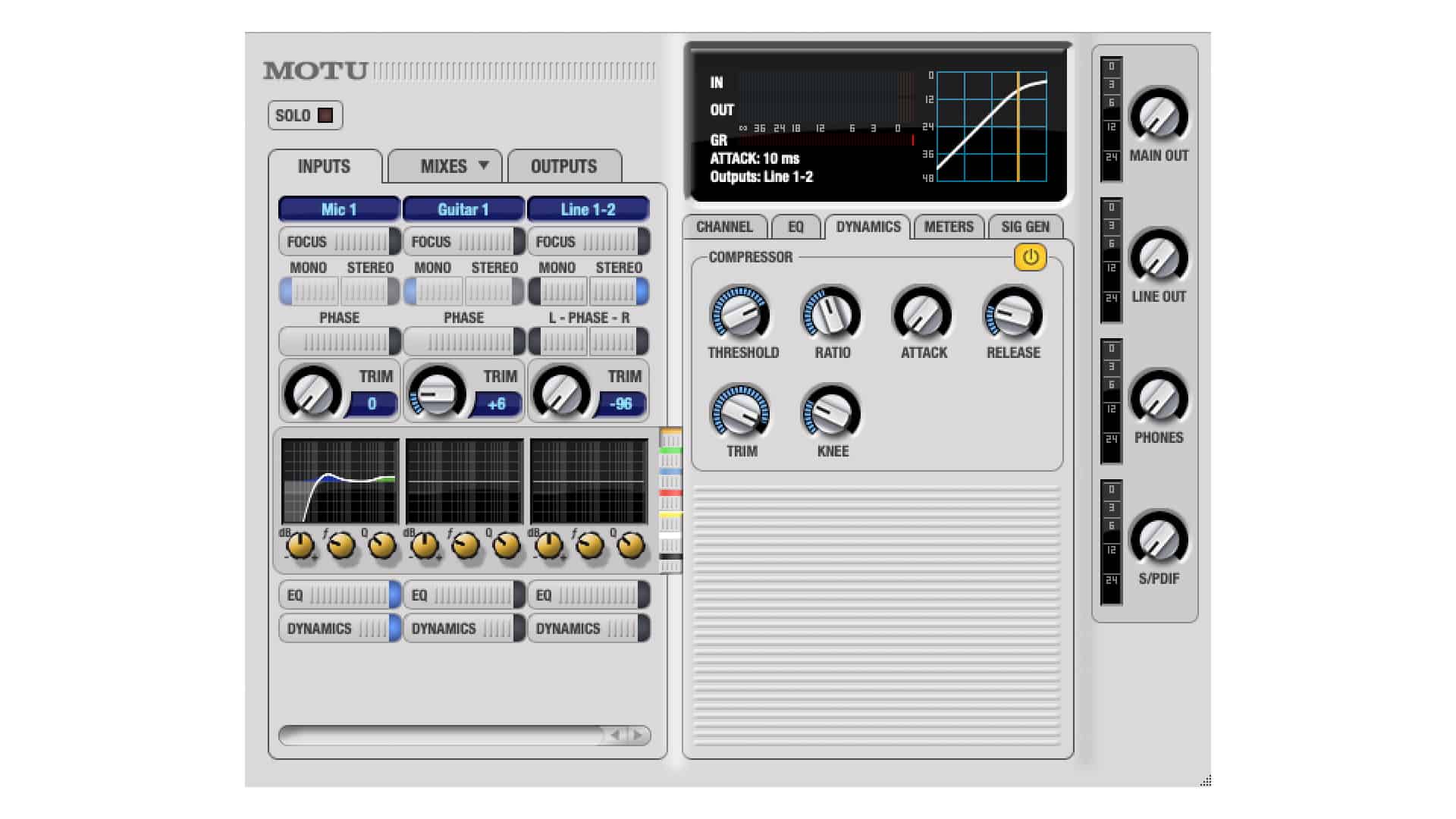 Genial ist meines Erachtens, dass Du den EQ und Kompressor nicht nur auf die Eingänge, sondern auch auf die Ausgänge anwenden kannst. Falls dir nämlich der Headphone-Ausgang mal zu leise sein sollte, kannst Du etwas tricksen, indem Du den Kompressor mit deiner gewünschten Einstellung aktivierst, und mittels Ratio-Regler das Kopfhörersignal komprimierst und via Trim-Regler wieder lauter machst. Je nach Song mag ich es manchmal nämlich etwas lauter, als es gut für mich wäre. Letztendlich geht es ja darum, dass man sich mit seinem Mix wohl fühlt. Dennoch mein Appell: Zu laut ist bekanntermaßen nicht gesund für deine Ohren. Gehe daher behutsam mit dieser Methode um.