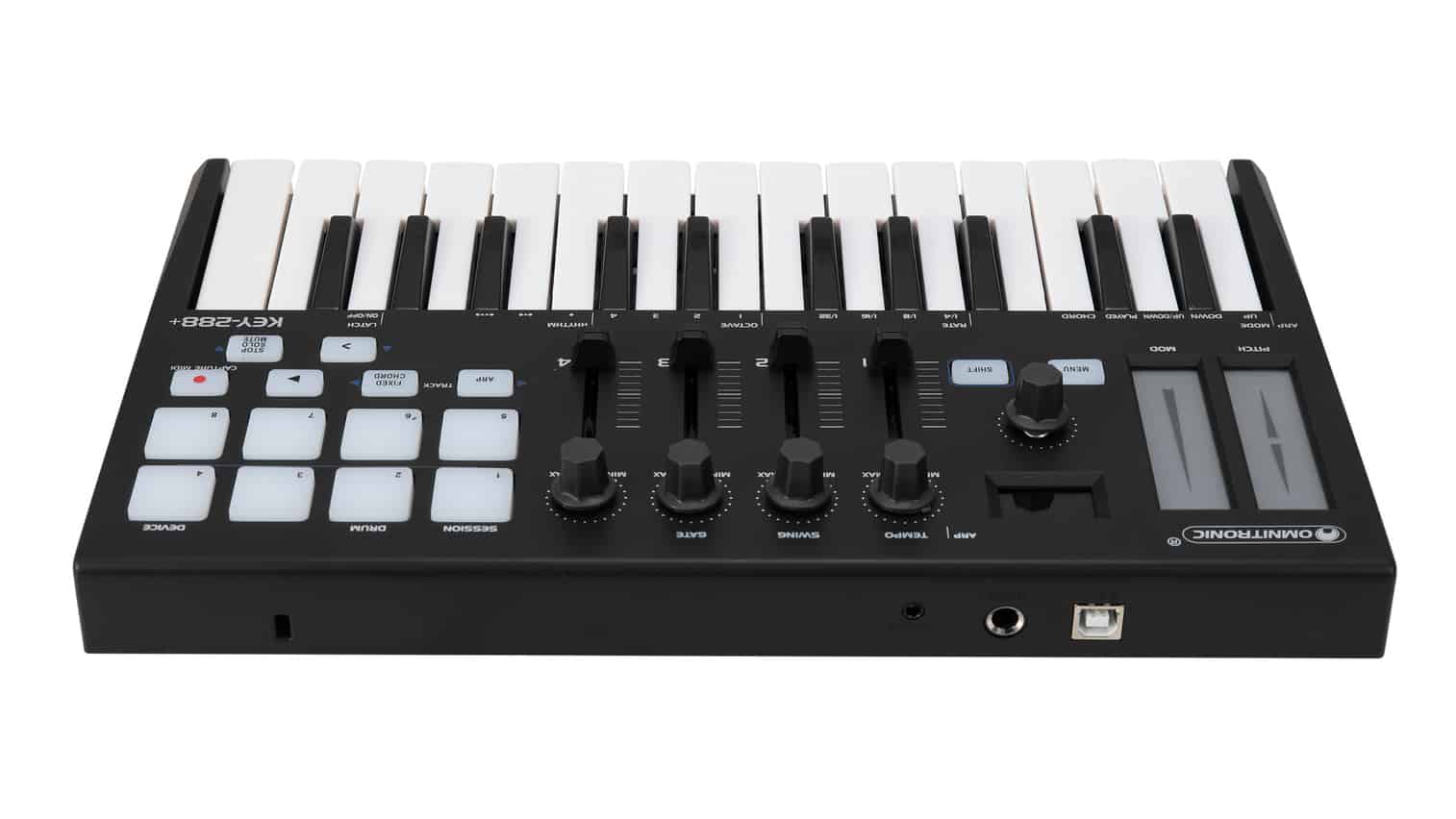OMNITRONIC KEY-288+ ist ein kompakter MIDI-Controller mit 25 anschlagsdynamischen und leisen Mini-Tasten, zwei Touchstrips für Pitch-Bend und Modulation, vier zuweisbaren Fadern und Reglern, einem Push-Encoder, acht beleuchteten Drum-Pads und einem OLED-Display für die Bedienung.