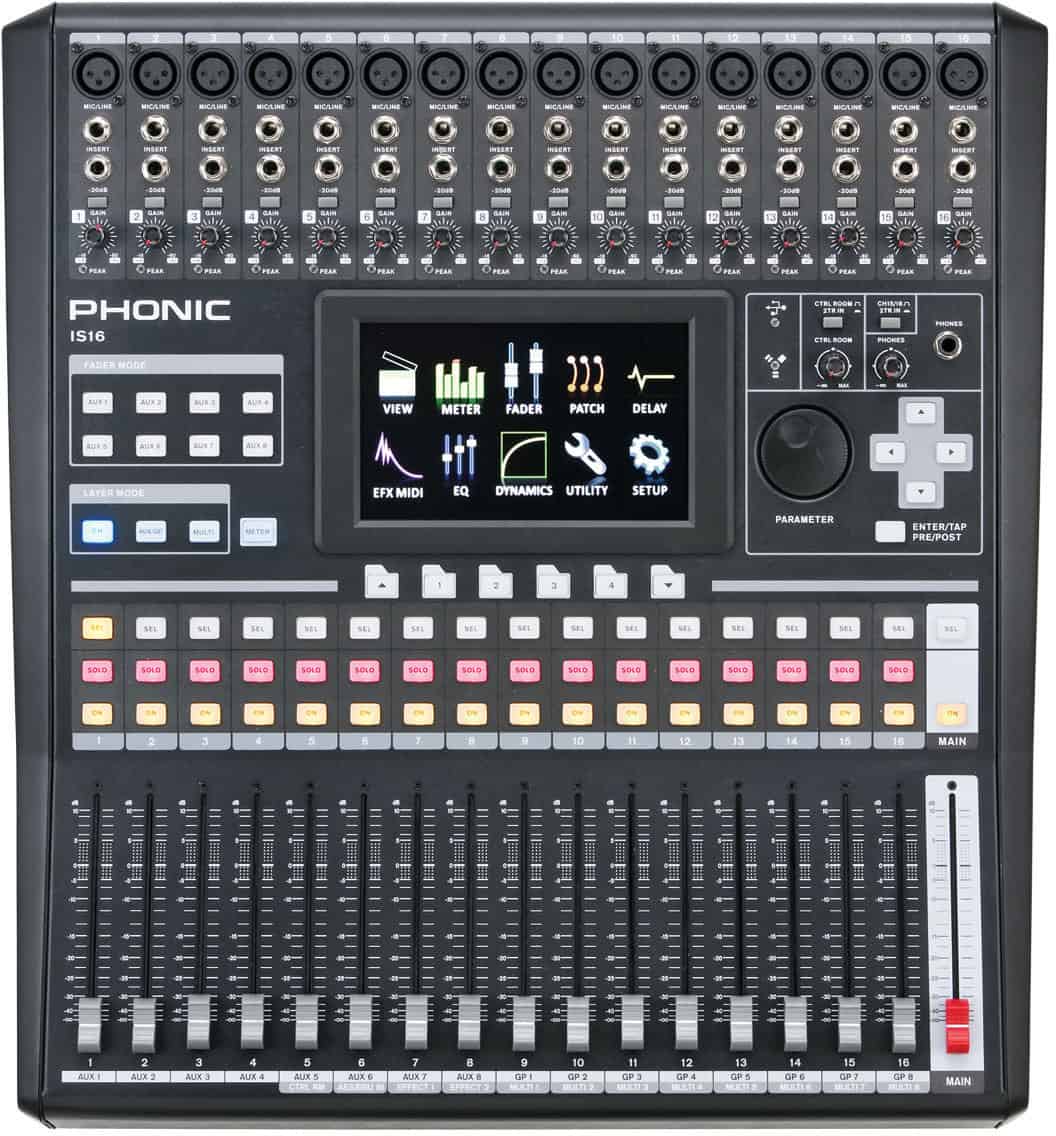 Das Phonic IS16 ist ein digitales Mischpult und bietet 16 Mono-Kanalzüge, jeweils mit Inserts und Phantomspeisung, die auf 8 Subgruppen und 8 AUX-Wege geroutet werden können. Unter anderem stehen 8 symmetrische Einzelausgänge und digitale AES/EBU-Schnittstellen zur Verfügung. 17 Motorfader mit 100 mm Laufweite sind an Bord. Das integrierte Audio Interface wandelt mit maximal 24 Bit & 96 kHz. Zwei Effektprozessoren sowie Werkzeuge zur Dynamikbearbeitung stehen zur Verfügung. Ein Monitor lässt sich via VGA und eine Maus via USB anschließen.