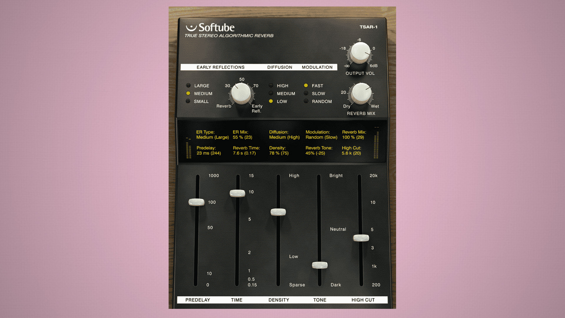 Das ist die Bedienoberfläche am Softube TSAR-1 Hall-Plugin