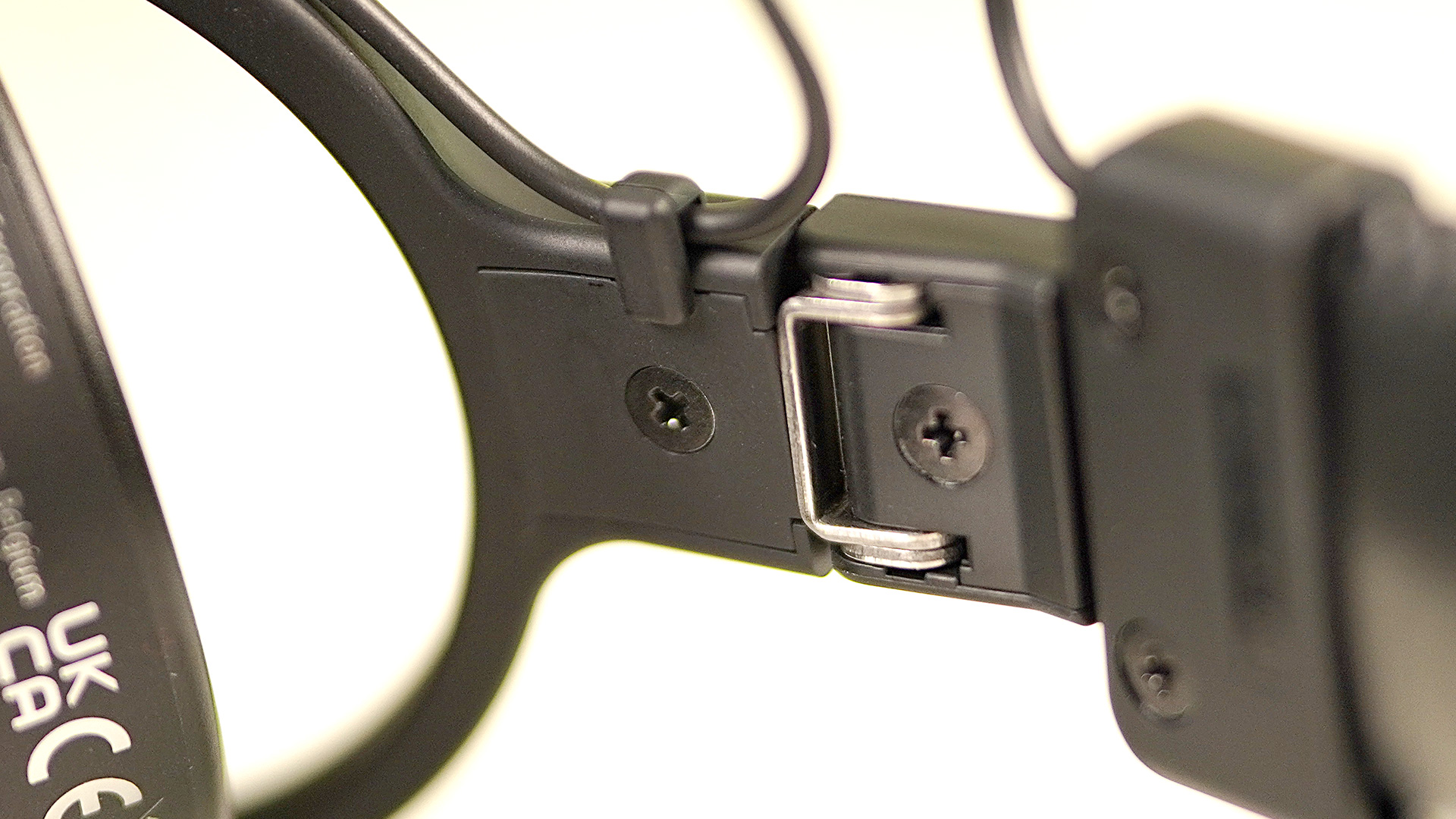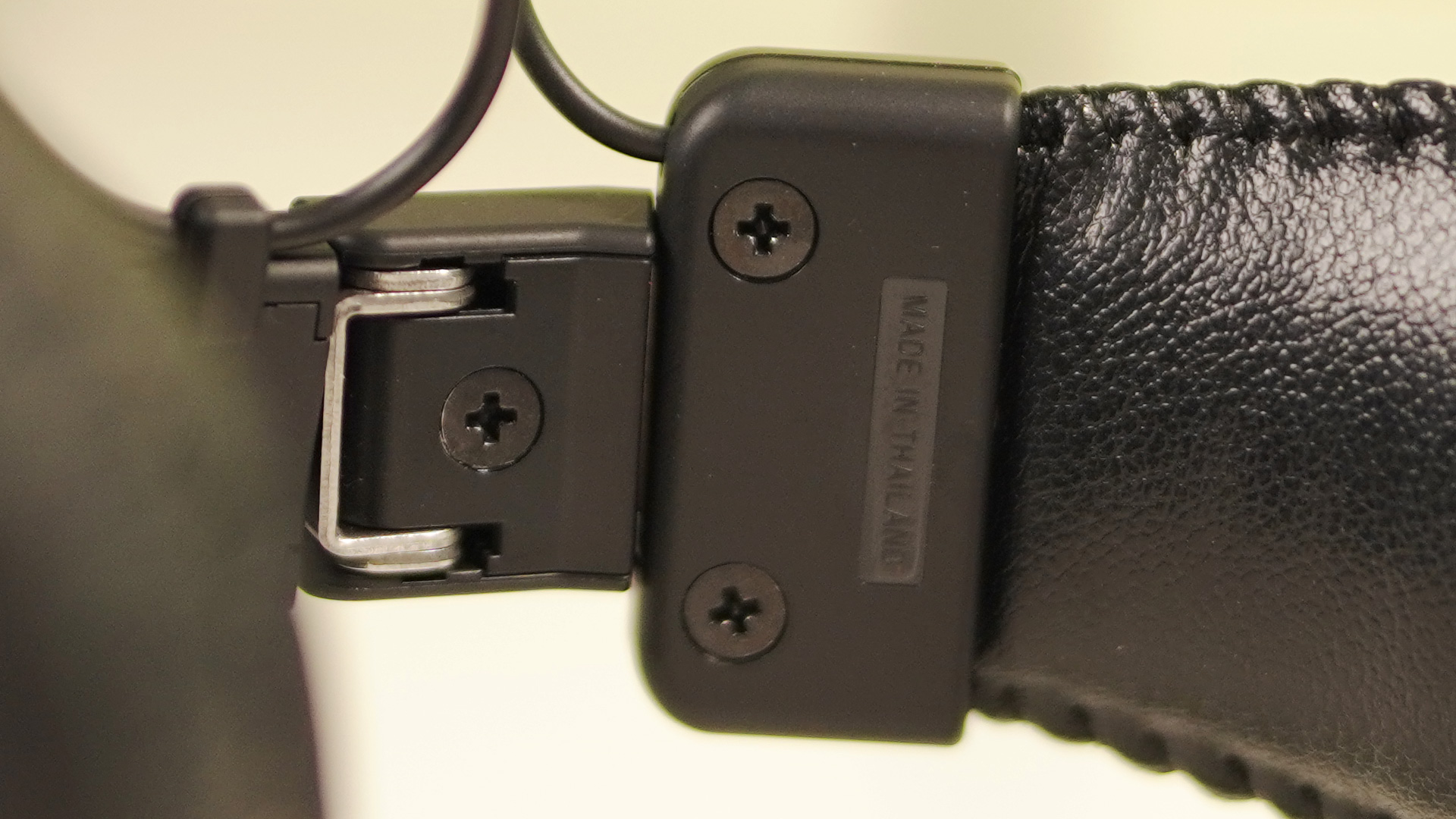 Die gut 1 Millimeter dicken Verbindungskabel liegen zwischen Bügel und Ohrschalen frei, was durch den Klappmechanismus wohl nicht anders zu lösen war.