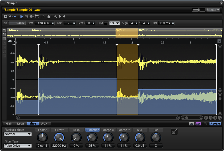 Es gibt Modi für das automatische Slicing anhand erkannter Transienten, auf der Basis des Grids oder anhand beider Variablen in Kombination. Mit den Regler für den Schwellenwert, Empfindlichkeit, Slice-Minimallänge und dem Poti zur Verzerrung der Abstände zwischen den Slices anhand des Grids ist die Grundausstattung vorhanden; komplettiert wird das Ganze durch Filter zur individuellen Bearbeitung jedes Slices. All das gelingt einwandfrei, wobei die Slices nach dem Zerschnipseln automatisch auf die MIDI-Noten ab C3 gemappt werden. Sehr schön.