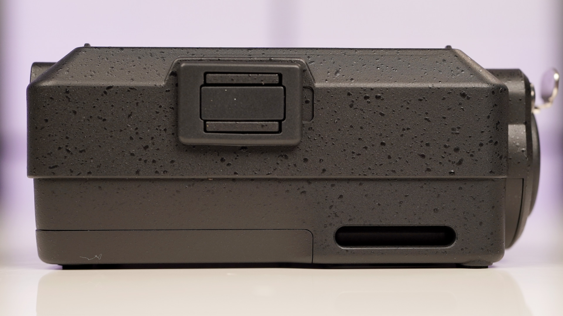 Der Power-Schalter findet sich auf der rechten Seite und ist als zurückschnellender Schieberegler mit etwas wenig Grip ausgeführt. Dieser muss für mehrere Sekunden nach unten geschoben werden, um das Gerät auszuschalten.