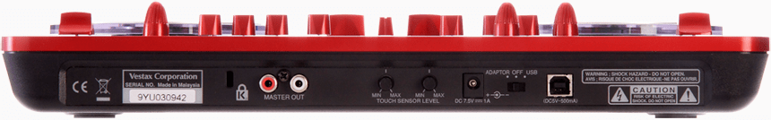 Alternativ zur Stromversorgung per USB-Kabel verfügt der Vestax Typhoon über eine Buchse, in die Du ein separat zu erwerbendes Netzteil stöpseln kannst, falls die Speisung über den USB-Port deiner Wahl nicht ausreichen sollte.